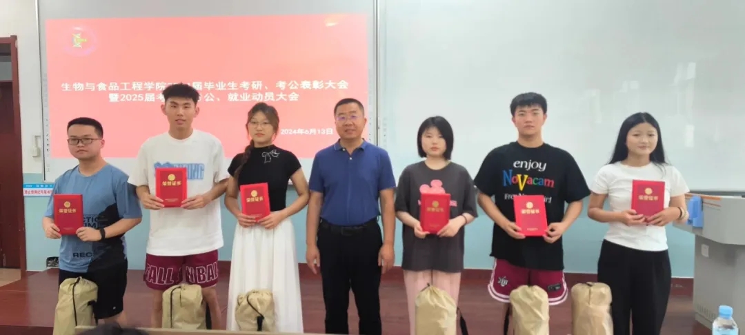 为了表彰2024届考研、考公学子的优异表现,激发2025届学生考研、考公、就业热情,向2025届学生传授考试经验,明确考研、考公、就业目标,yl6809永利官网集团于2024年6月13日一教309举办了2024届毕业生考研、考公表彰大会暨2025届考研、考公、就业动员大会。本次会议由永利集团办公室主任裴林主持,学院院长张元新、学院党委副书记孙京南、食品科学与工程系系主任马先红、生物工程与技术系系主任谢莹、辅导员刘人宁老师、20级学生代表及21级全体学生参会。