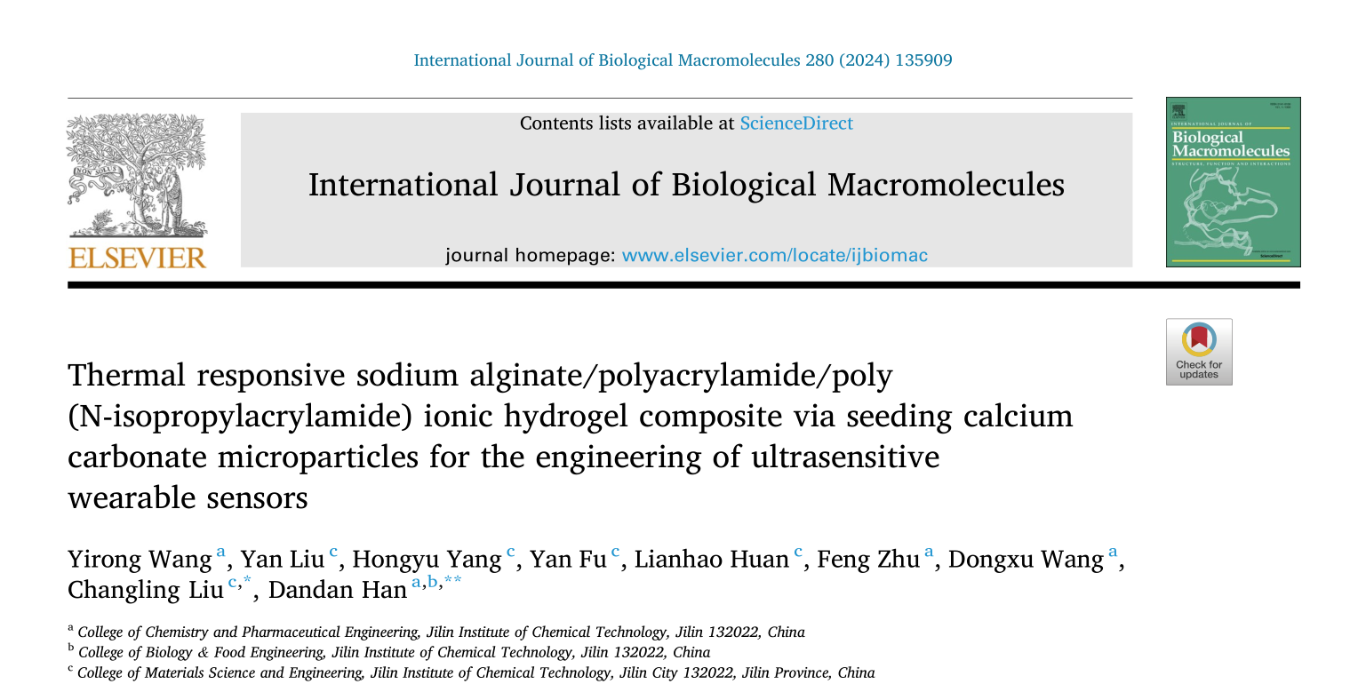 Yirong Wang, Yan Liu, Hongyu Yang, Yan Fu, Lianhao Huan, Feng Zhu, Dongxu Wang, Changling Liu *, Dandan Han *. Thermal responsive sodium alginate/polyacrylamide /poly (N-isopropylacrylamide) ionic hydrogel composite via seeding calcium carbonate microparticles for the engineering of ultrasensitive wearable sensors. Int. J. Biol. Macromol. 280 (2024) 135909.