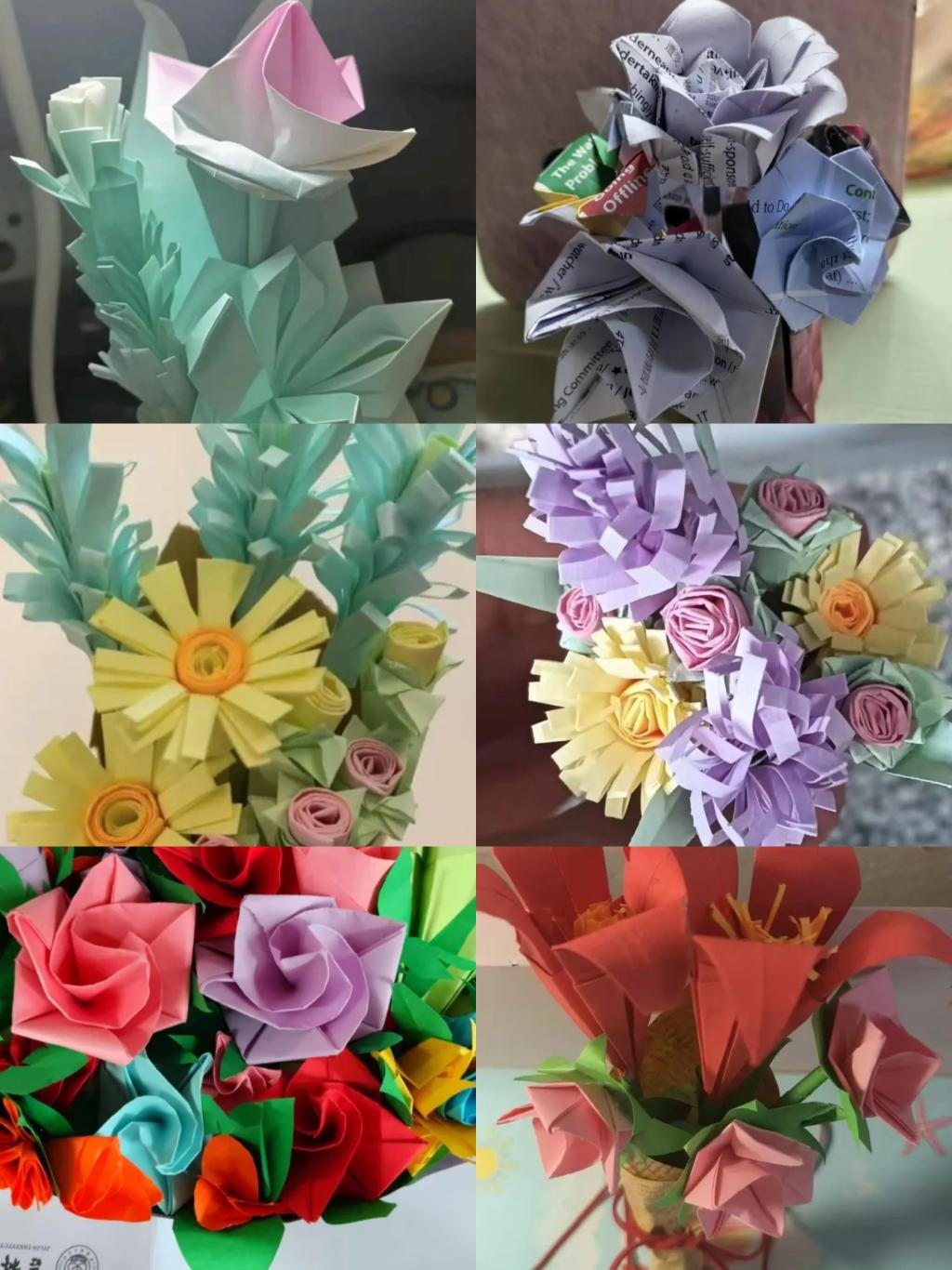 在作品征集环节,共收到二十余份风格迥异的折纸花束作品。这些作品不仅展现了创作者精湛的手工技艺,更承载着独特的创意与情感。每一束折纸花,都是同学们对美的理解与表达,是艺术与生活交融的生动写照。