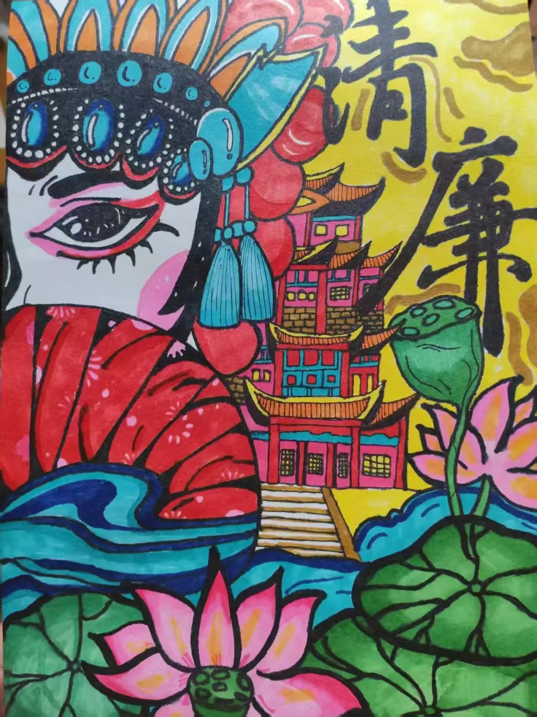 在校园廉洁文化建设浪潮中,yl6809永利官网集团学生以笔为媒,用创作传递廉洁精神。绘制水墨荷花的同学,反复晕染花瓣层次,让“出淤泥而不染”的意象跃然纸上。创作牡丹图的创作者,以浓淡相宜的色彩展现繁花盛放;或是用绚丽色彩搭配党徽、廉语,借活泼构图传递廉洁正能量。还有同学将传统戏曲元素融入创作,以鲜明色彩描绘戏曲人物、莲花与古建筑,让廉洁主题在传统文化交融中焕新。这些作品,无论哪种形式,都饱含巧思——把对廉洁的理解,化作灵动线条、斑斓色彩。