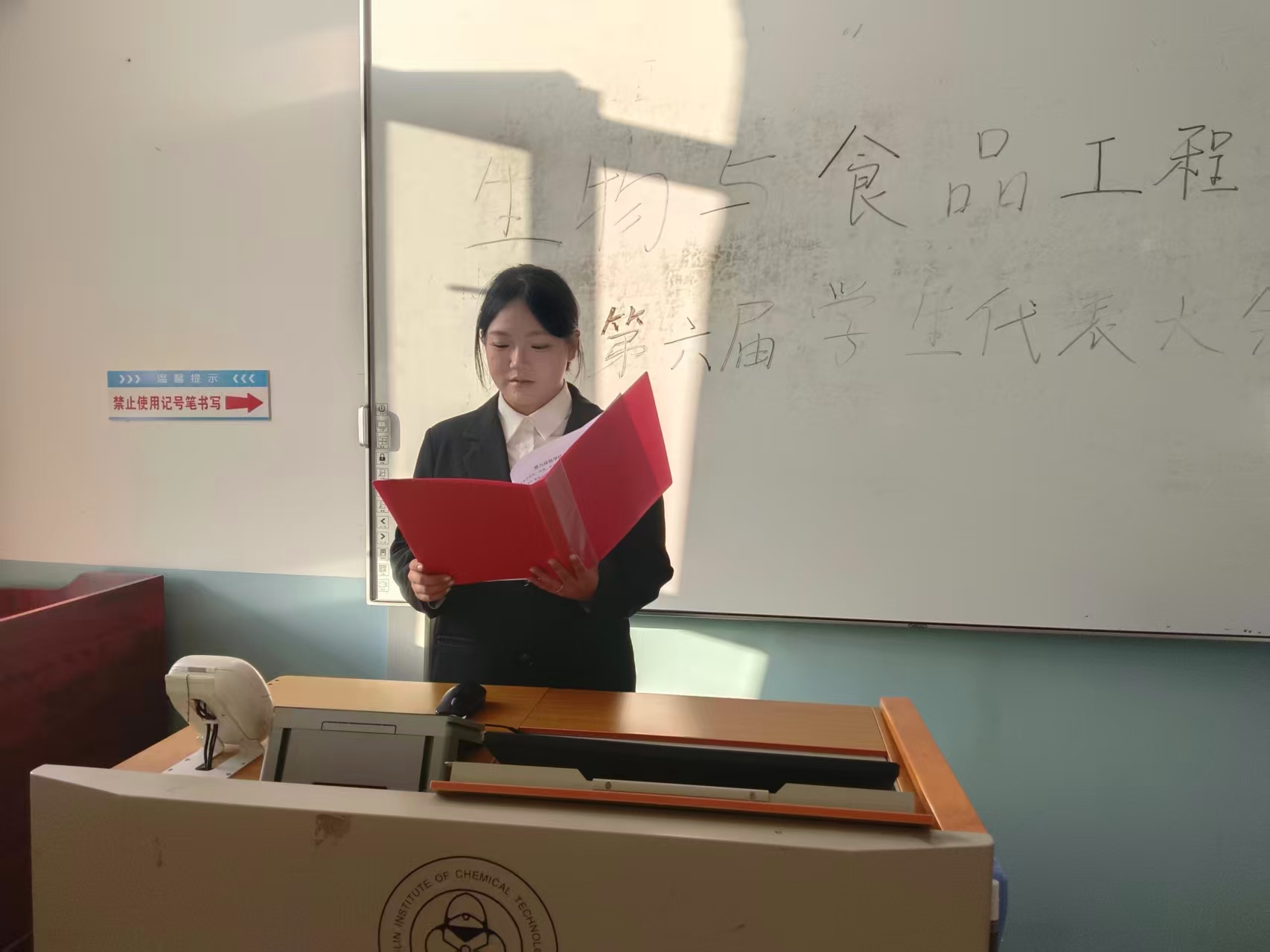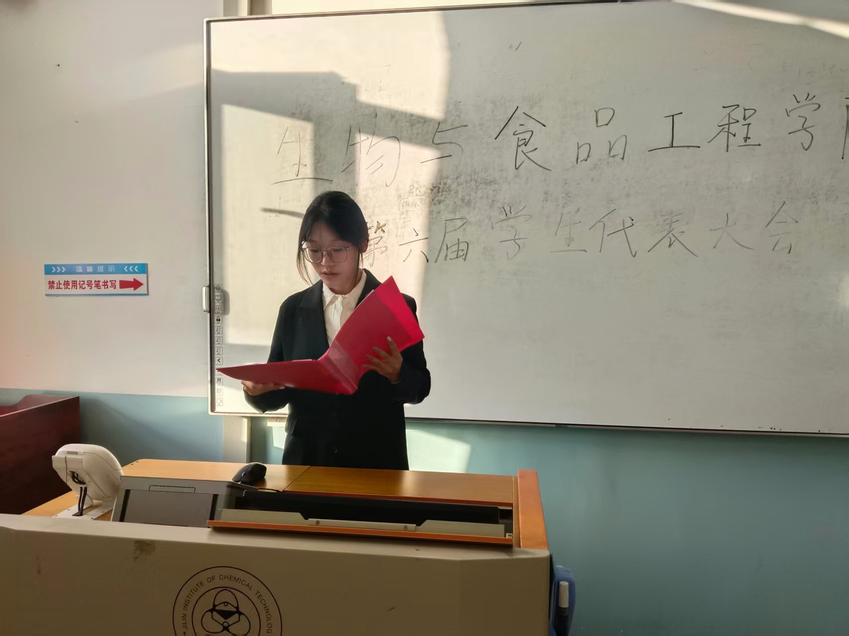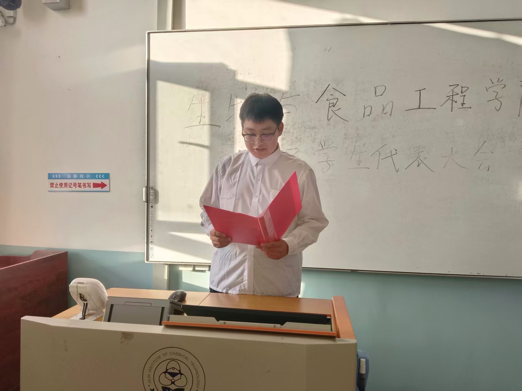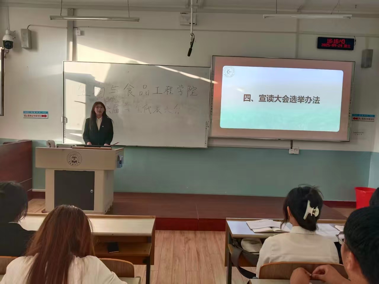 大会主持人李欣明宣读大会选举方法和本次监票人名单,保证此次大会投票的公平、公正、公开。学生代表投票选举,通过无记名投票,差额选举的方法进行选票。